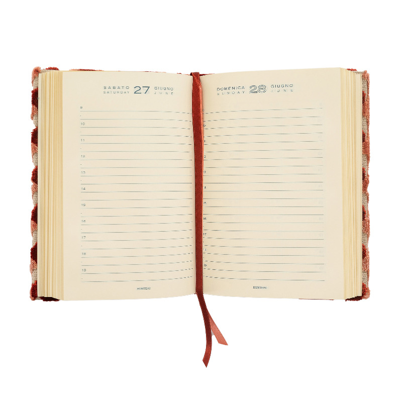 Agenda 12 mesi giornaliera rivestita in velluto fantasia.