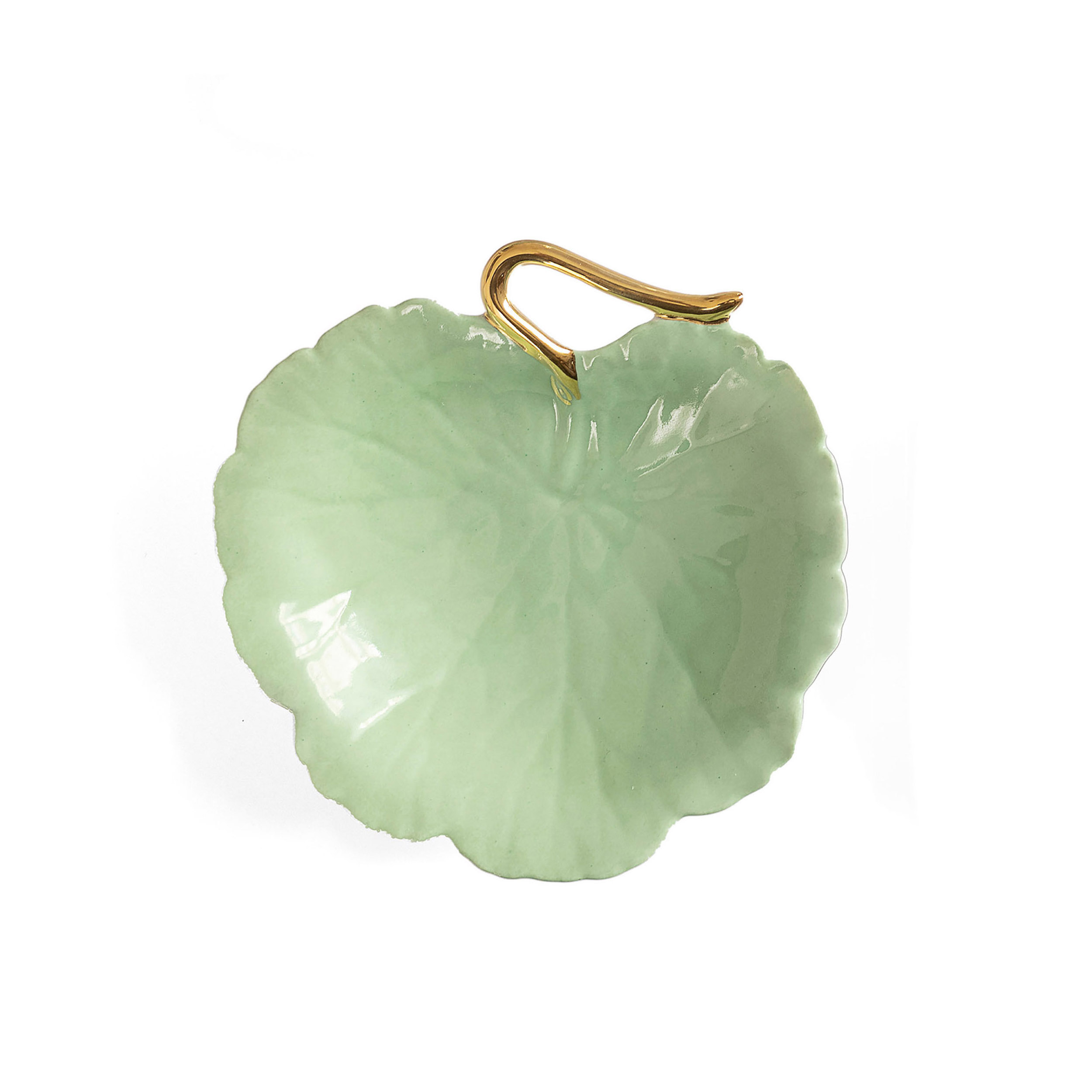Foglia geranio in porcellana di Limoges decorata a mano con decoro in oro zecchino.